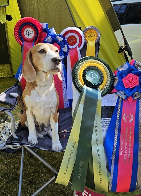 Beagles habe ich jetzt seit 2000 und bisher waren es immer Rüden (Die natürlich auch alle traumhaft waren und sind :-) !). Mit Jolie erfülle ich mir einen langehegten Traum und somit beginnt hier nun ein ganz neues Kapitel. Ich bin sehr gespannt auf ihre Entwicklung und unsere gemeinsame Zukunft. Ich danke Alexandra Mans (www.family-delight.de) ganz besonders für diese besondere, wunderschöne Hündin mit dem bezaubernden Charakter. Wir kennen uns jetzt schon so lange und ich bin sehr stolz darauf, dass Du mir Jolie anvertraut hast. In ihre Mutter Seze hab ich mich schon verliebt, als sie noch Welpe war. Dieser unvergleichliche Blick und dieser sanfte Ausdruck und ihr Wesen ließ mich schon damals dahinschmelzen. Und dann unser tolles gemeinsames Showerlebnis 2017 in Steinhagen: Harley BOB und Seze BOS (von 80 gemeldeten Beagles) unvergesslich und vielleicht ja ein gutes Omen!?